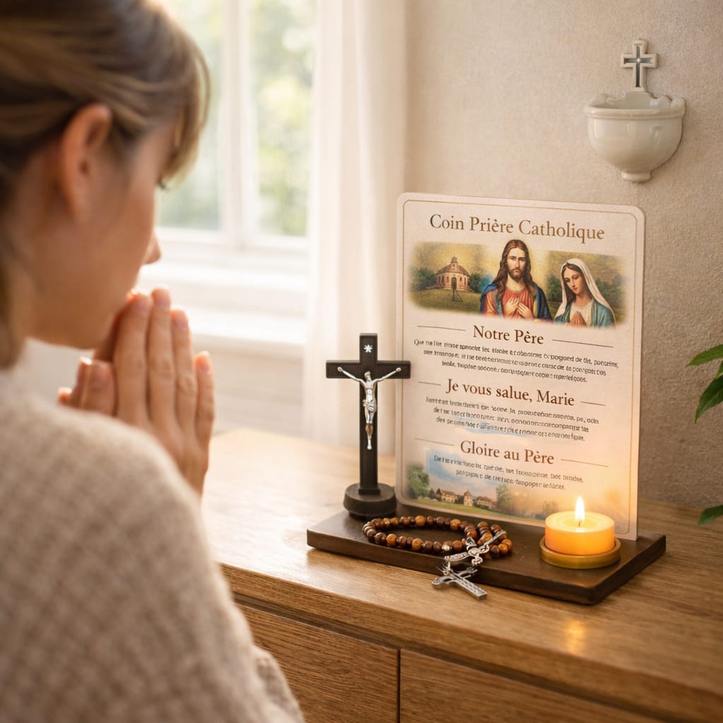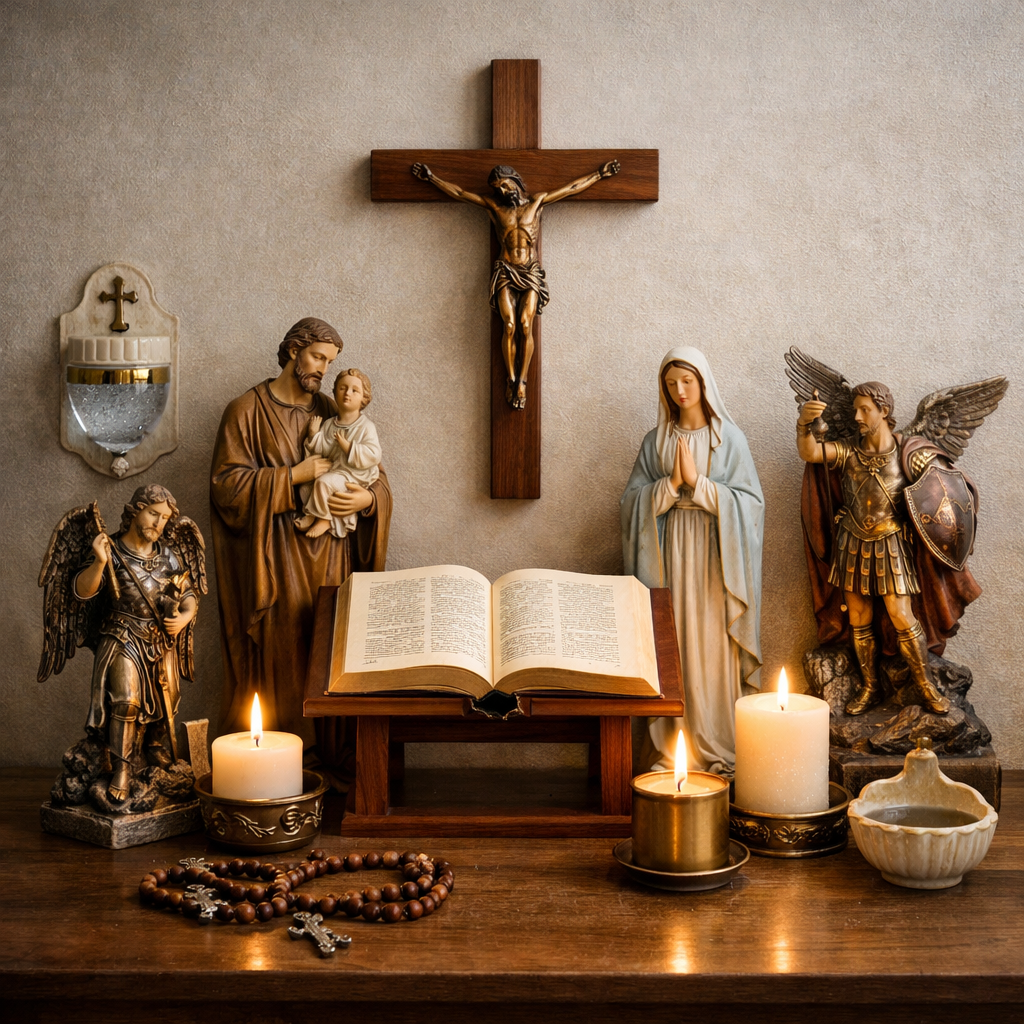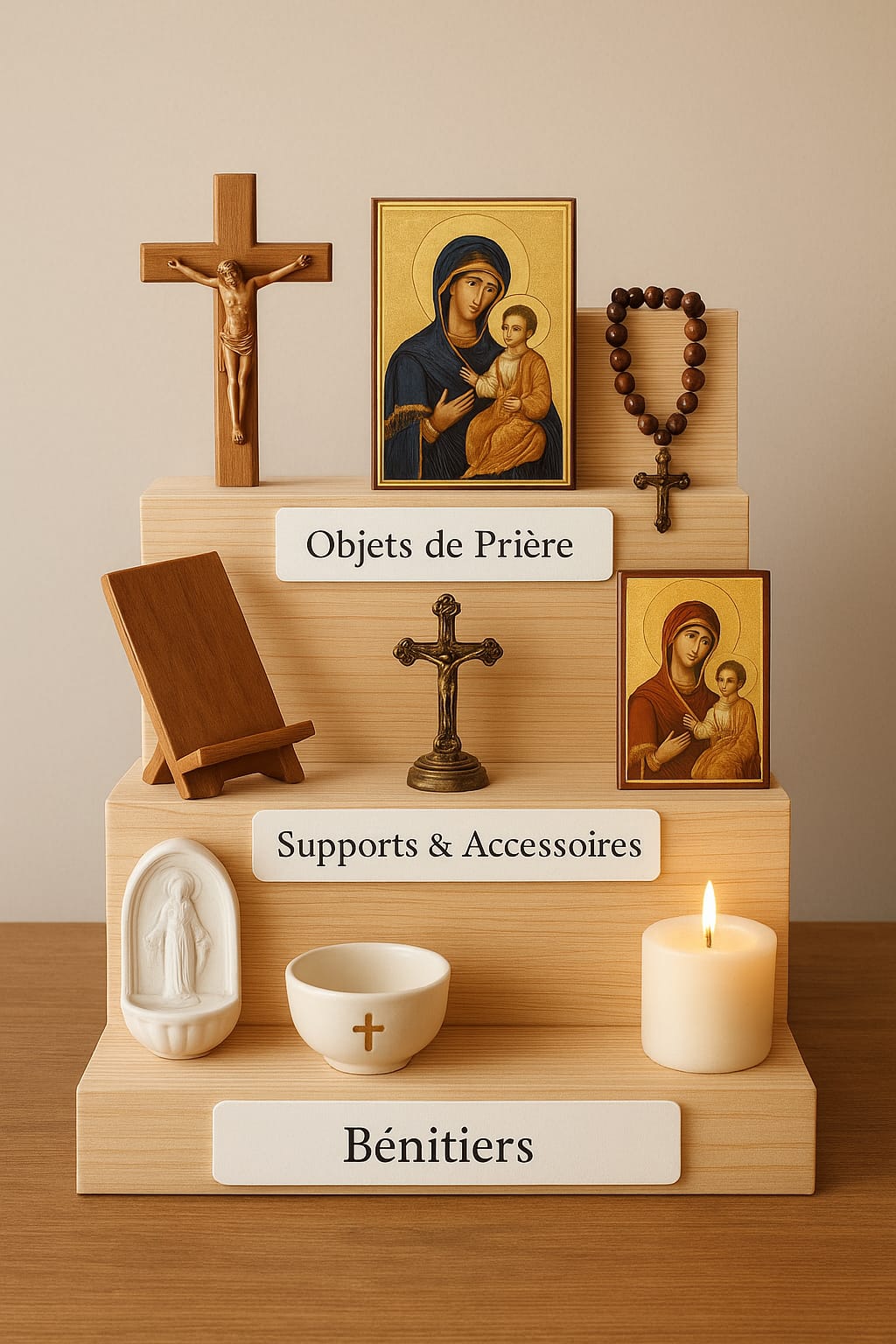 C’est un ensemble d’objets simples et choisis pour créer un coin de prière chez vous : crucifix, pupitre, bougies, statues, bénitier, chapelets…