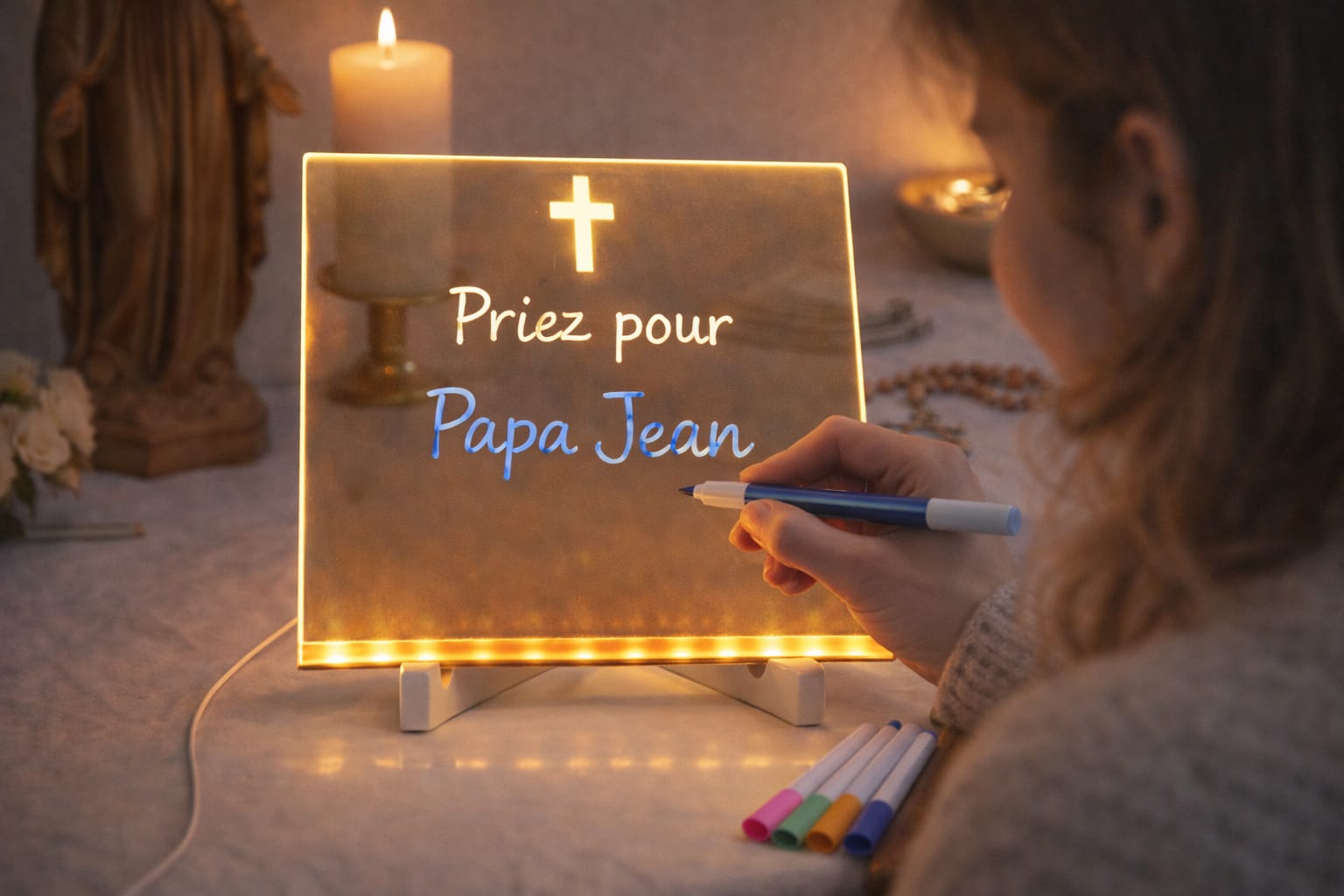 Cette planche lumineuse a été pensée pour les adultes souhaitant un support discret, lumineux et apaisant pour confier leurs intentions. Elle permet d’écrire, dessiner ou formuler vos prières, seul ou en famille, dans un moment de calme et de recueillement.
