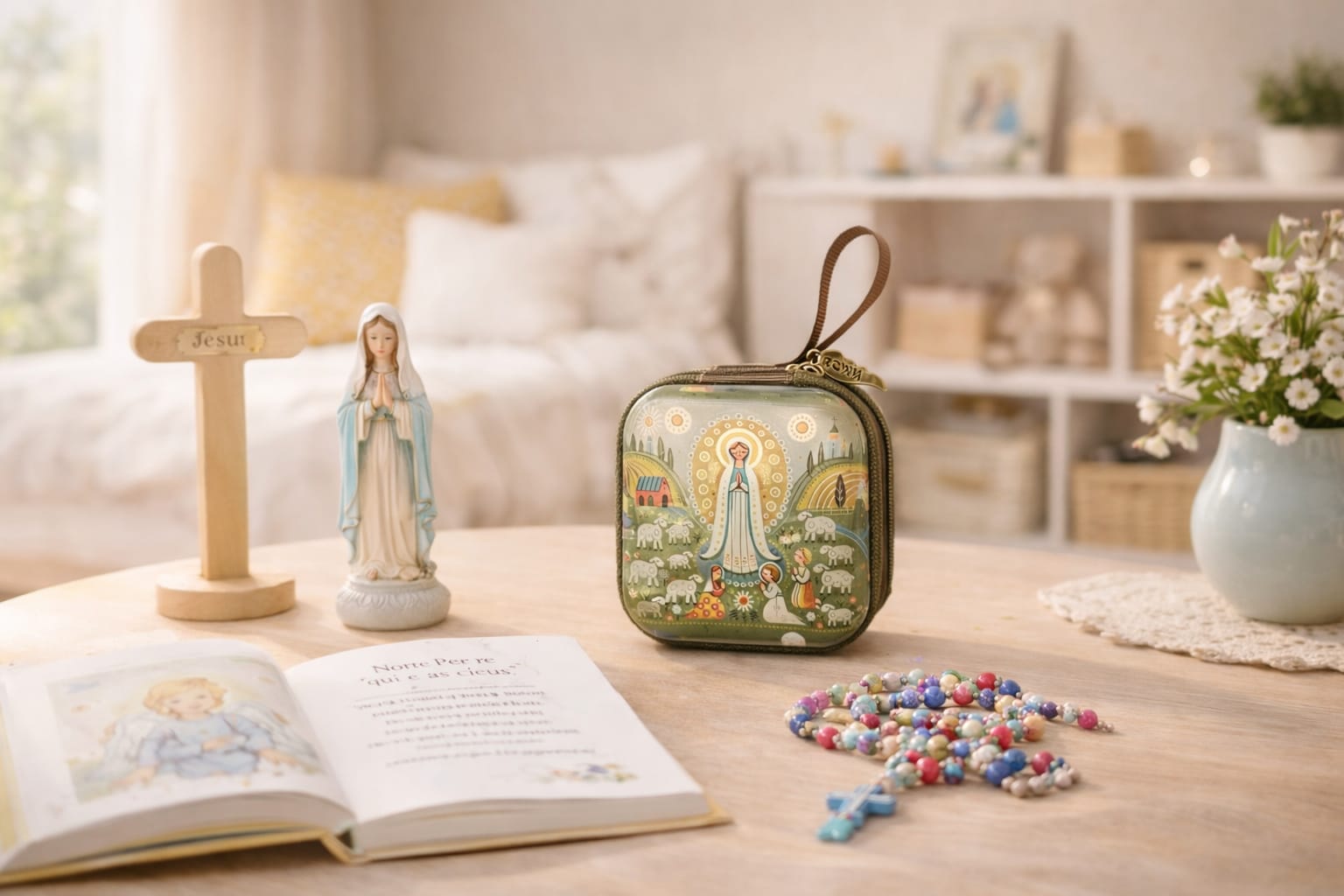 Ce petit sac de rangement de 7 x 7 cm est conçu pour protéger et transporter les objets religieux ou chapelets des enfants.